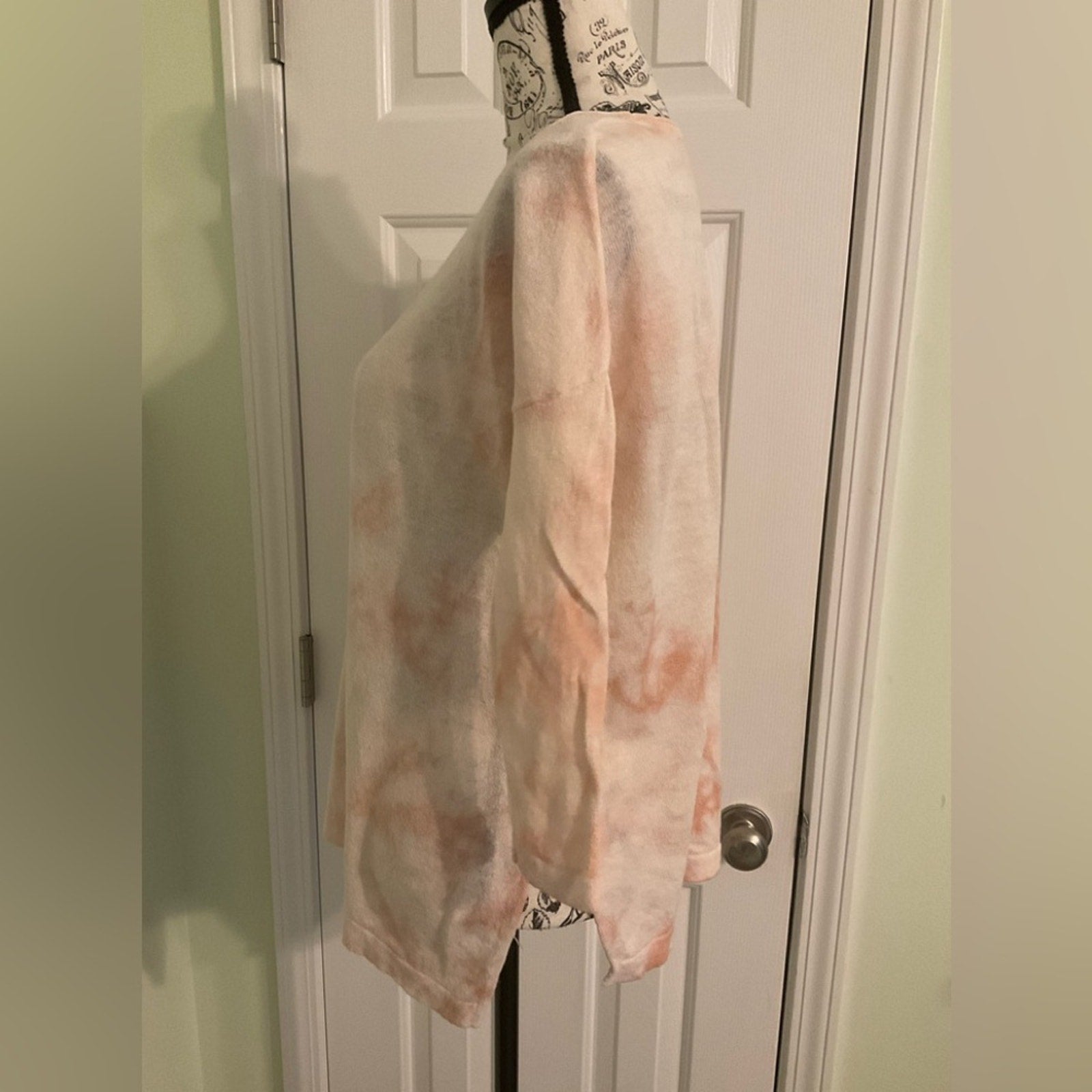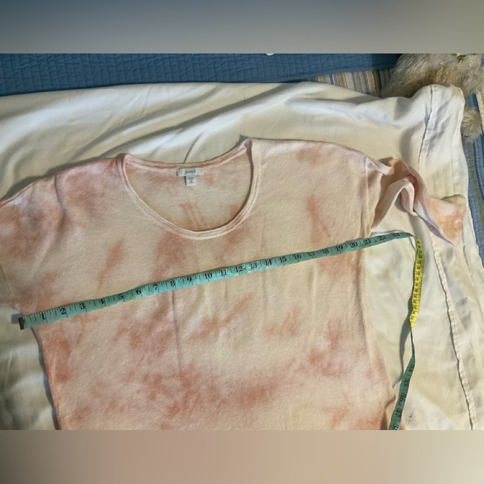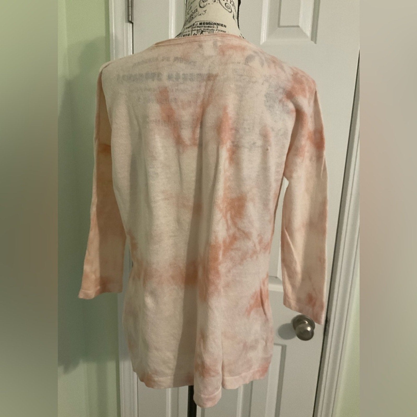 PureJill Linen Blend pullover top with 3/4 sleeves. The sides have slits at the hem. Also, this is a lightweight top. The color is a tie dye look of white blush pink and looks orange in places.