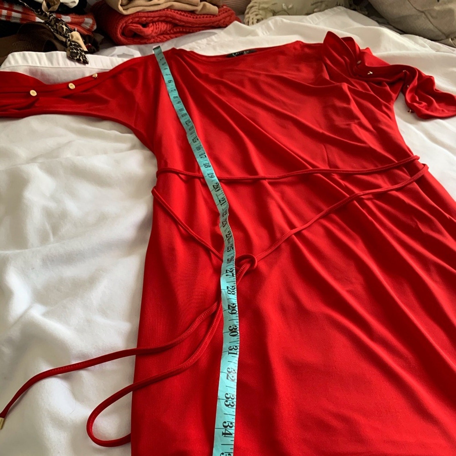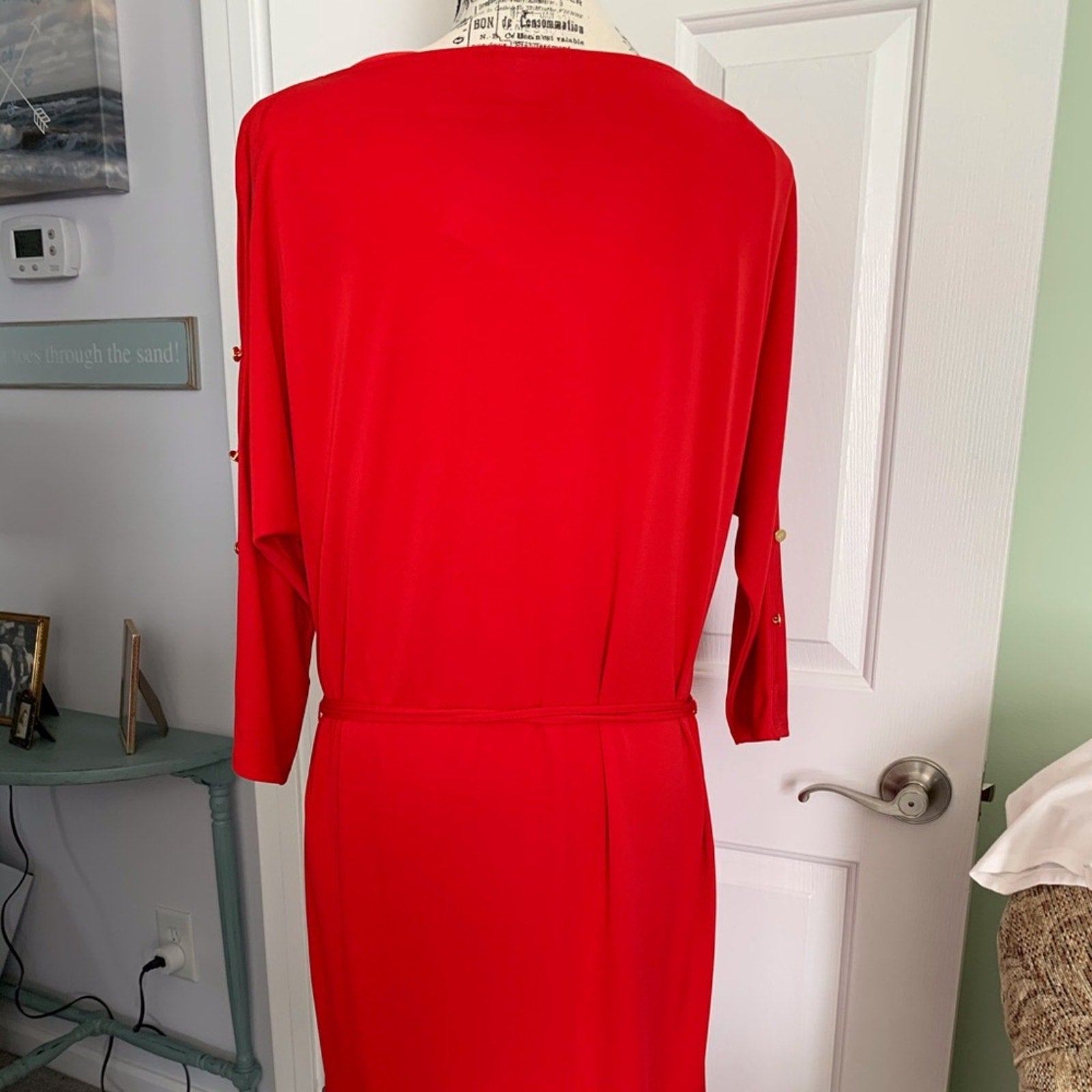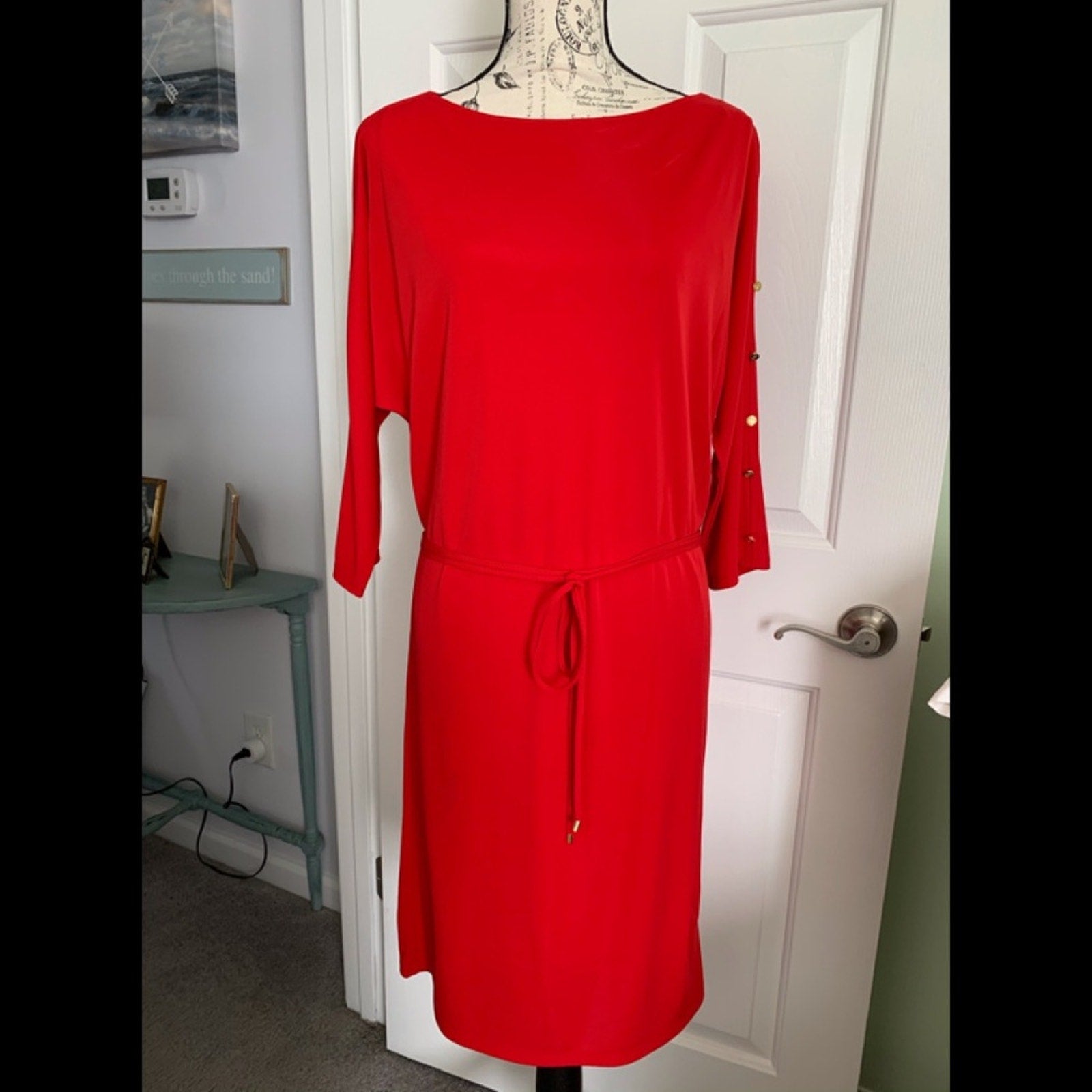 NWT - Simple but elegant little red dress that is lined and has a wrap tie belt at the waist and gold buttons on the 3/4 length sleeves with openings between the sleeves. This dress is heavy and is very slim fitting.