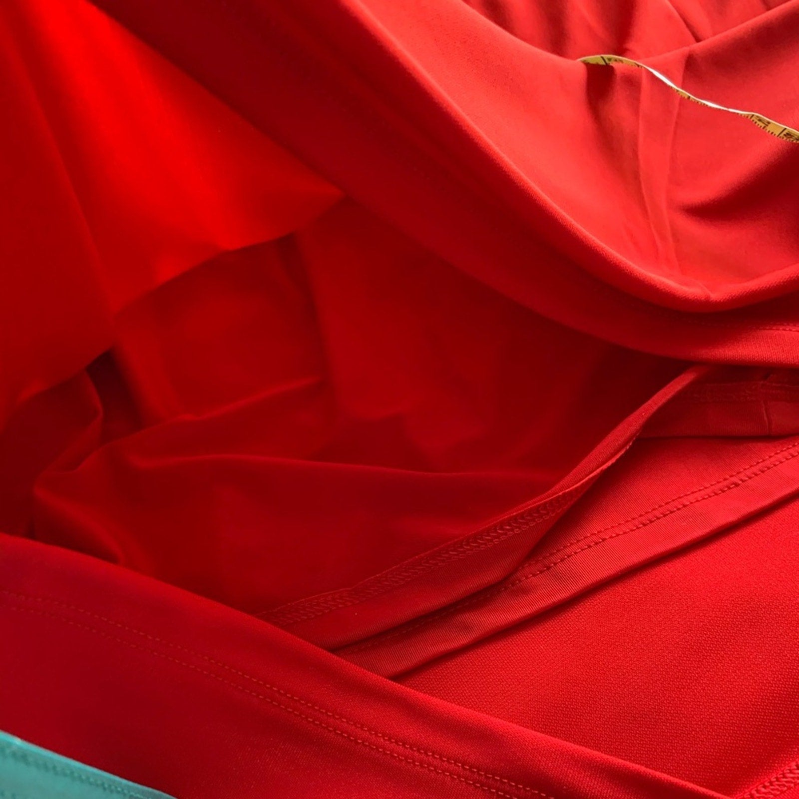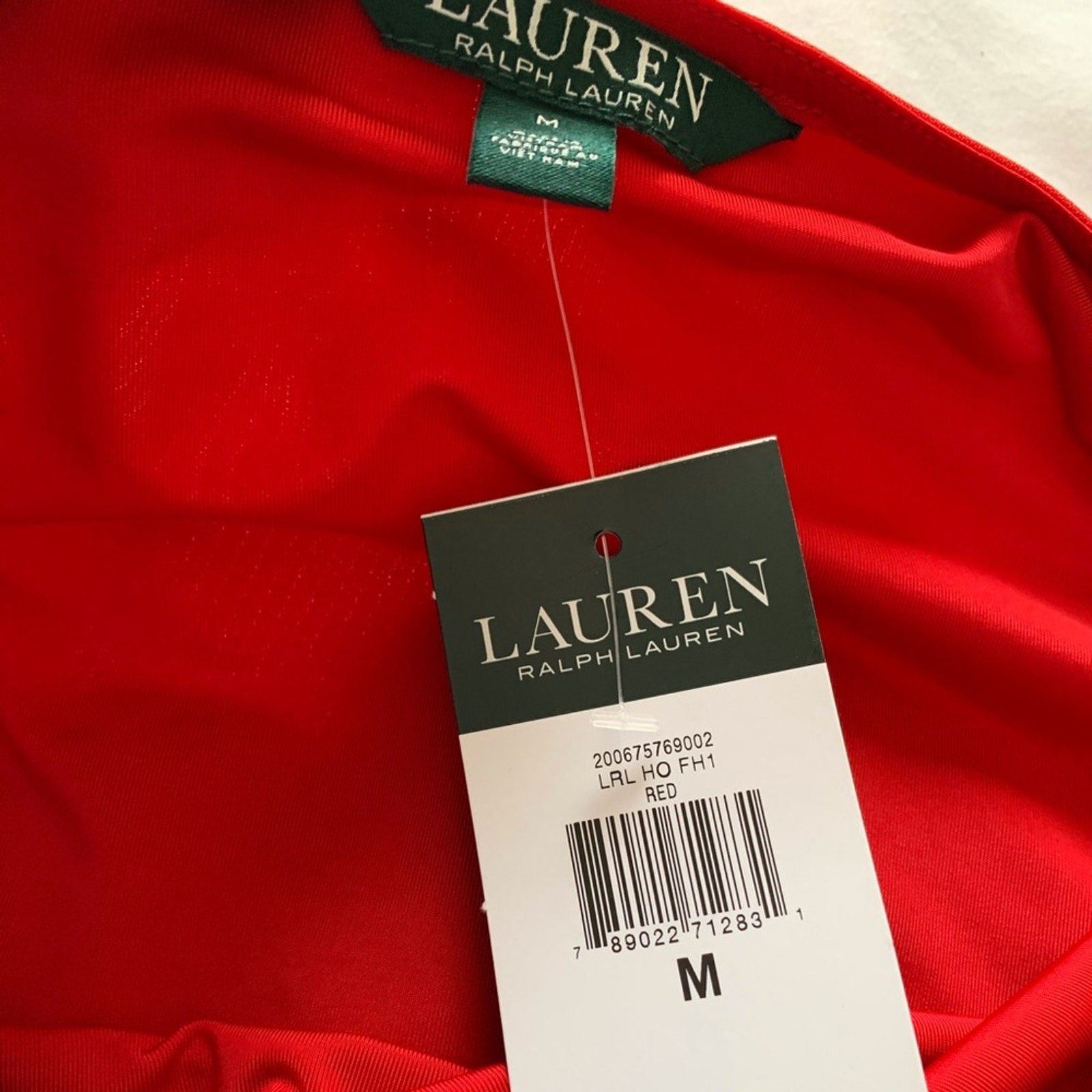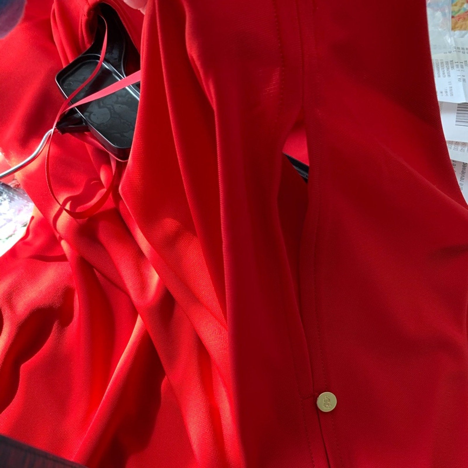NWT - Simple but elegant little red dress that is lined and has a wrap tie belt at the waist and gold buttons on the 3/4 length sleeves with openings between the sleeves. This dress is heavy and is very slim fitting.