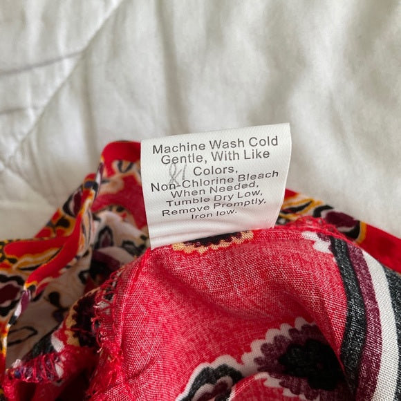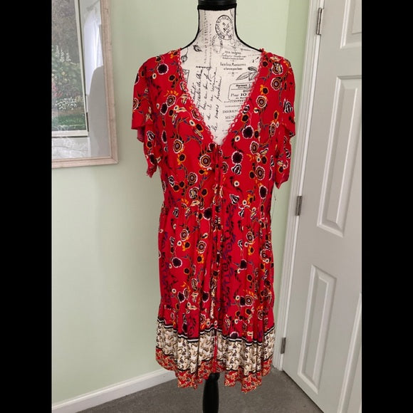 NWT! What a cute dress in red with other colors of white, black, cream. This has a deep v at the neckline with a tie look, also has a loop around the neckline. Short sleeves that actually have a slit look in those. Zipper in the back that is long below the waist.