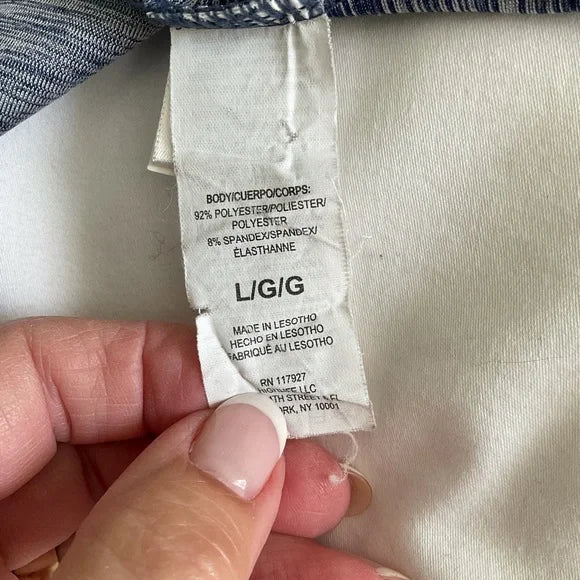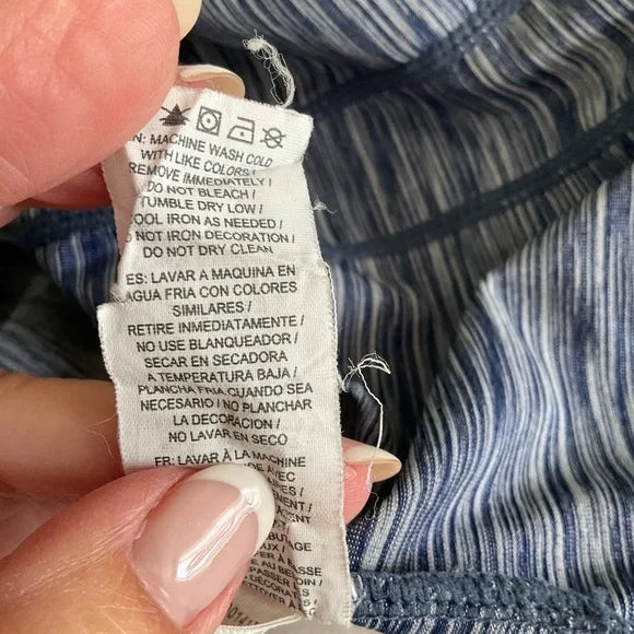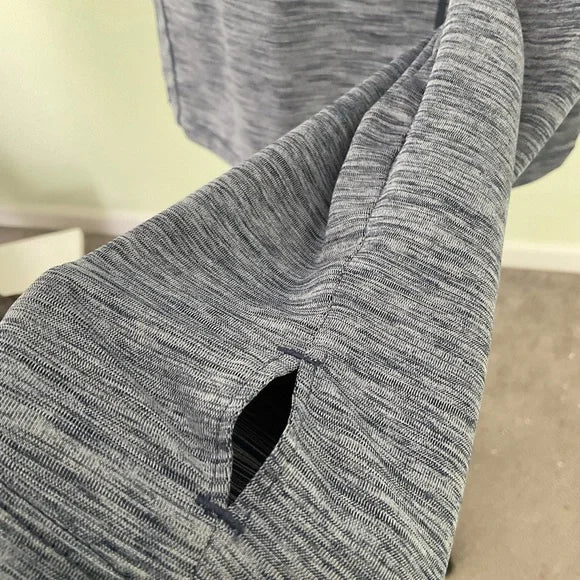 Reebok long sleeve athletic top in blue and white mingled color and darker blue seam detailing. This is a scoop neck and thumbholes at the end of the sleeves.