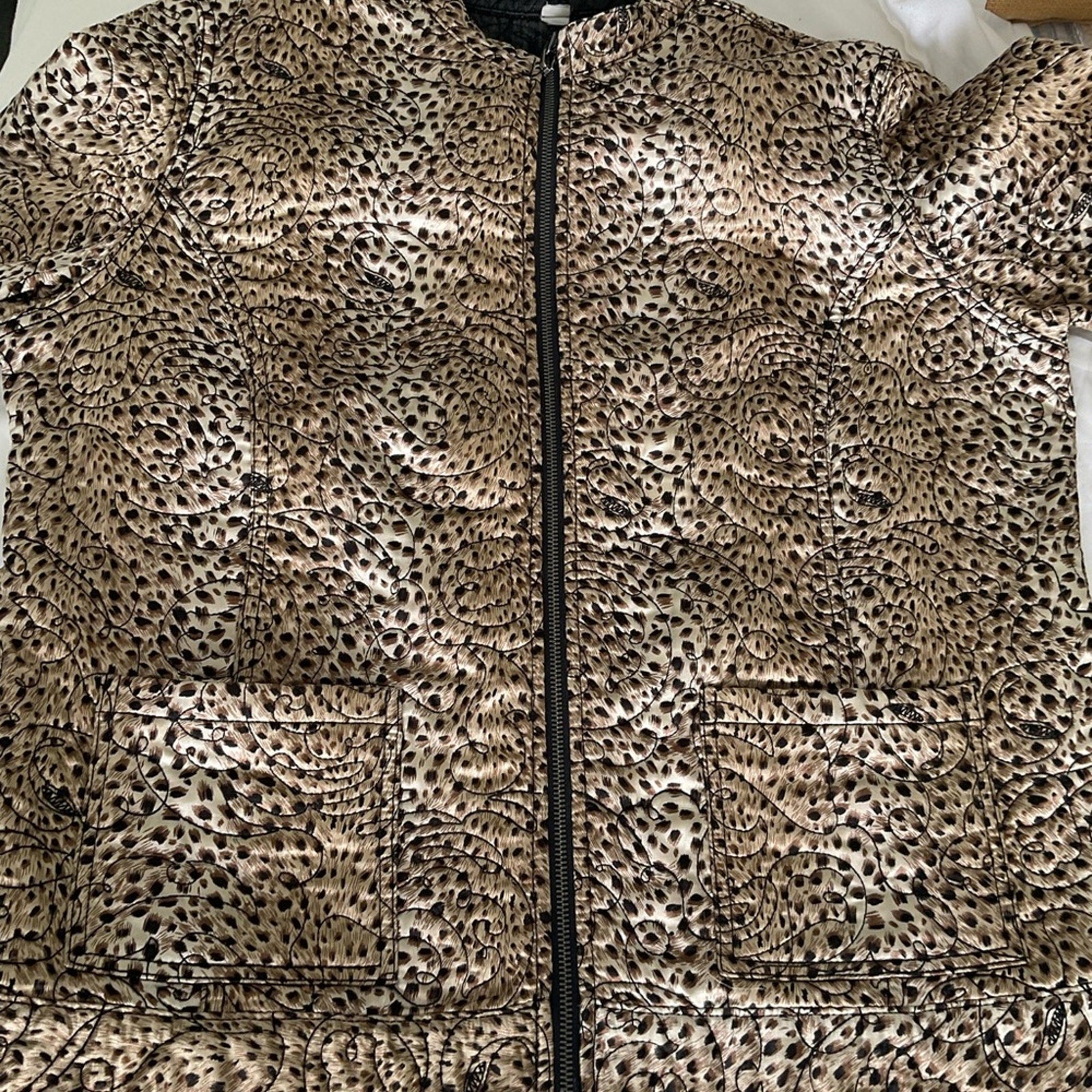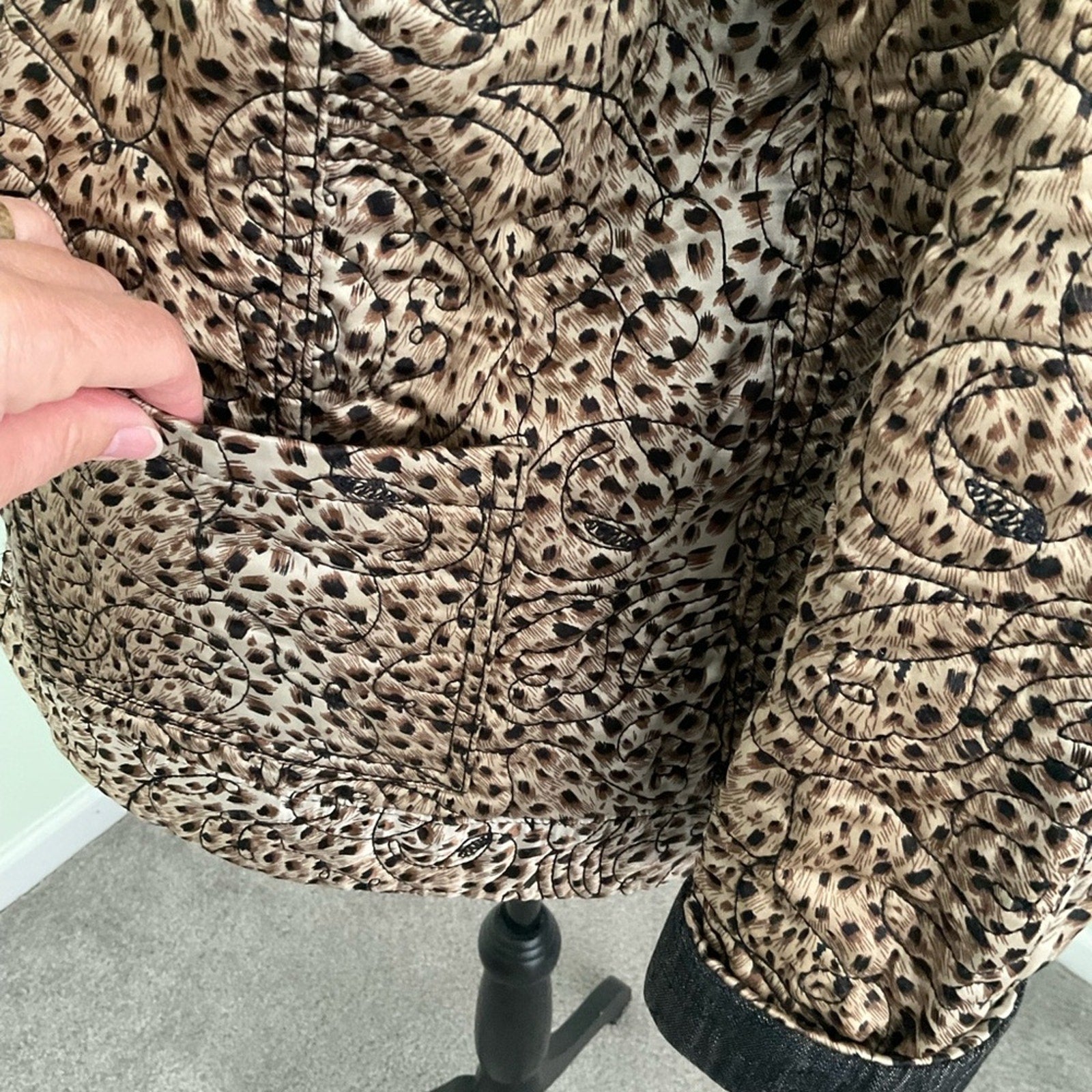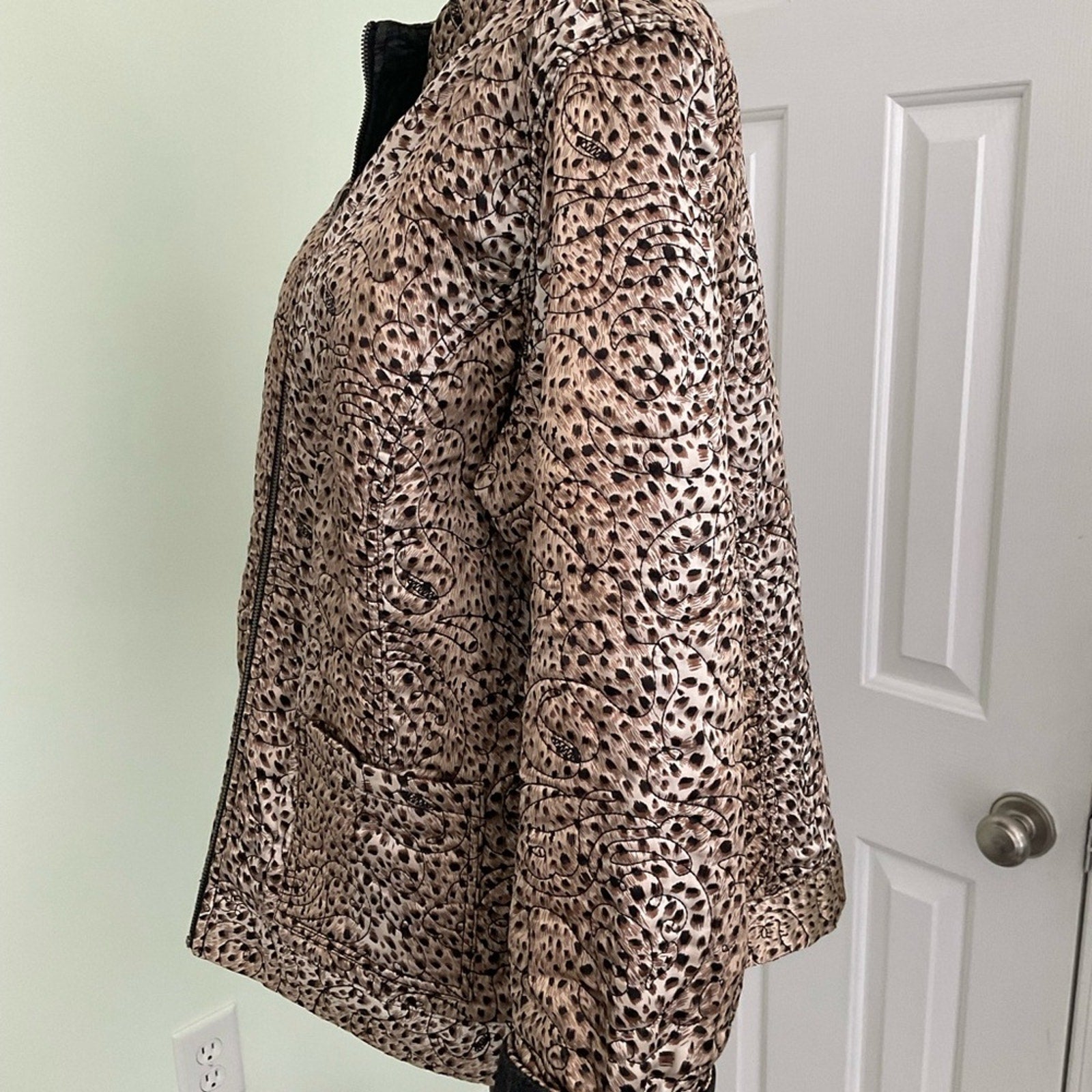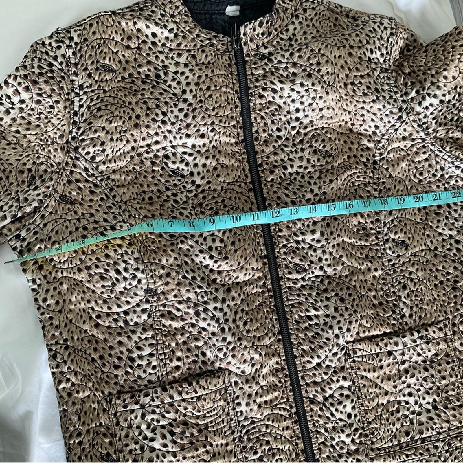 Reversible full zip Jacket that is leopard print on one side and solid black on the other. This is a quilted look. There are no tags since it is reversible. Has small front pockets.