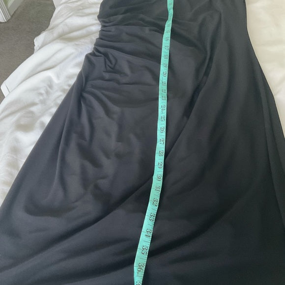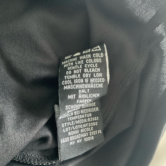 Ronni Nicole sleeveless black dress with a cinched look on the front of the left sleeve. Also, has a cinched look down the right side. This dress has a black lining.