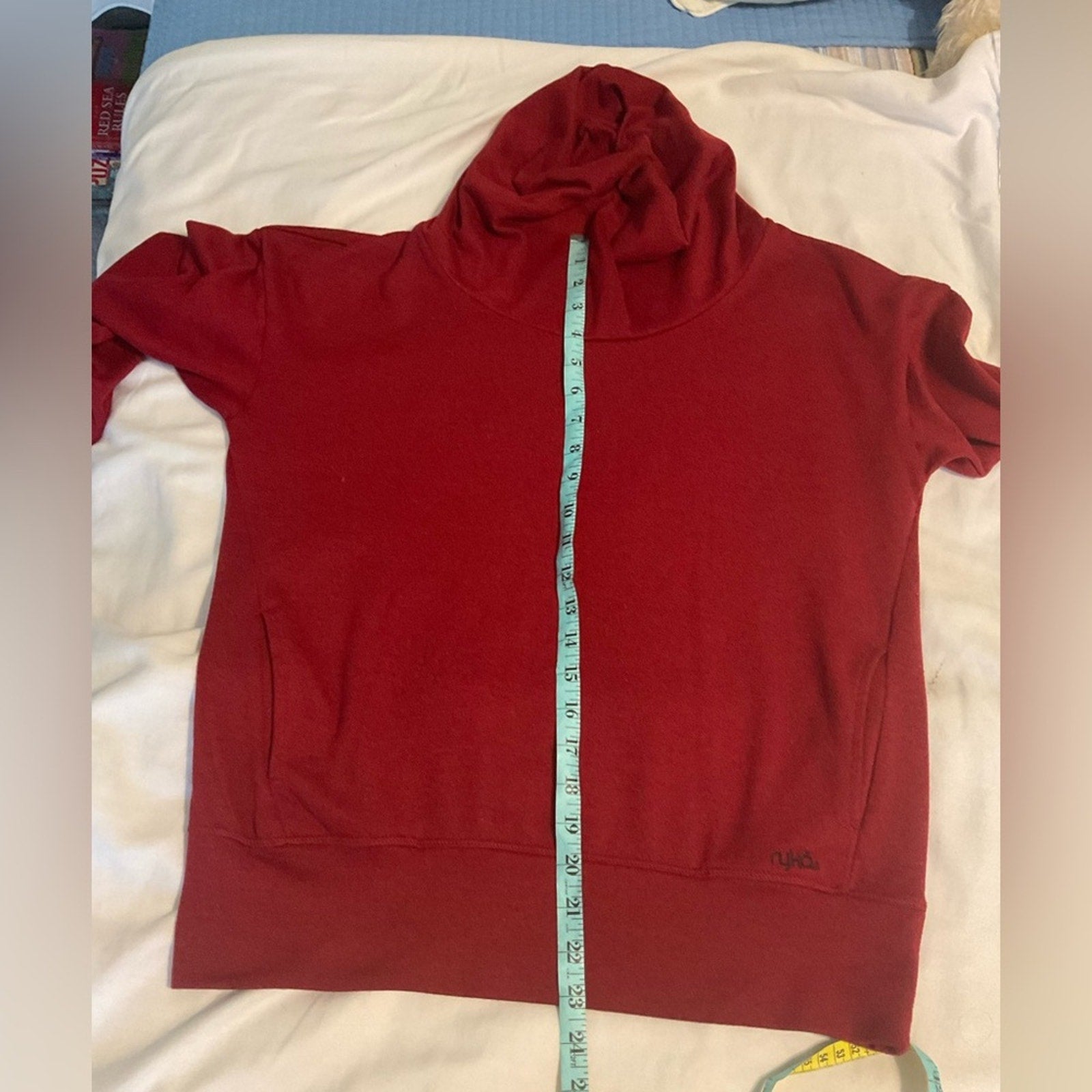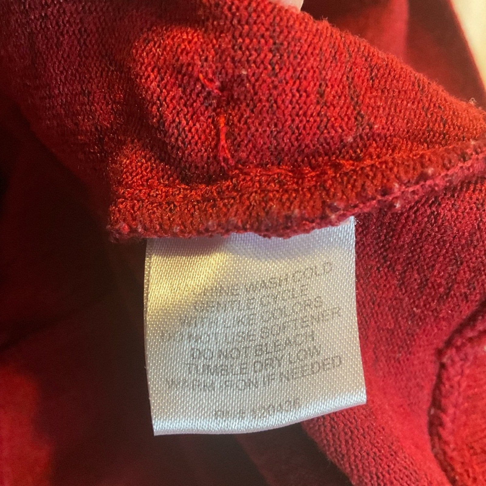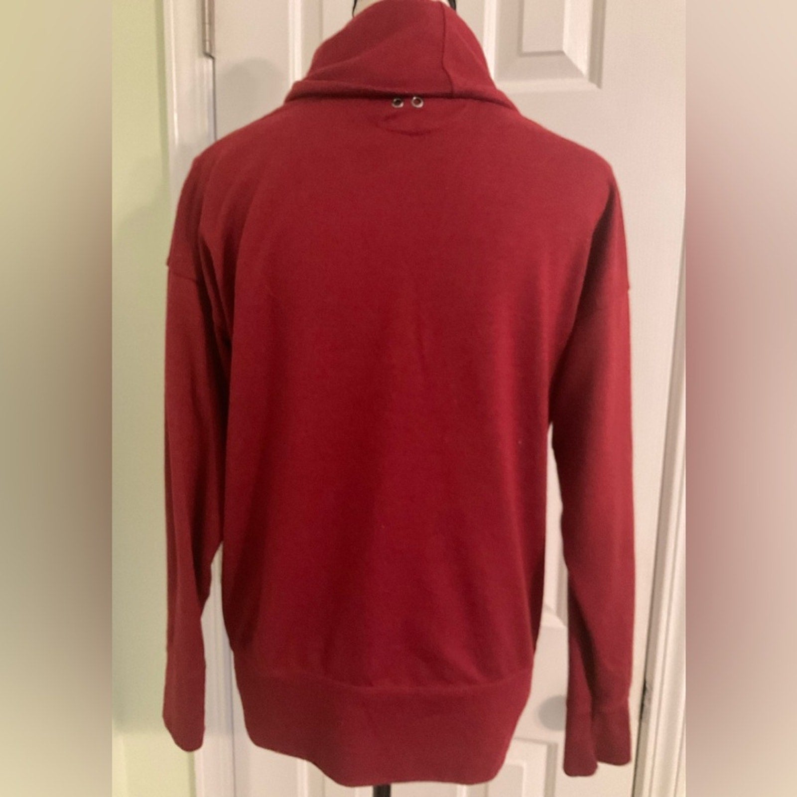 Ryka Turtleneck pullover with long sleeves and a banded waistband. This does have side seam pockets. And the name Ryka on the bottom left side. At the back top there are two holes with grommets and I don’t know what that would have been for. Please notice on the front close up picture what looks like a pic, but is just a piece of fabric, maybe an imperfection in the fabric.