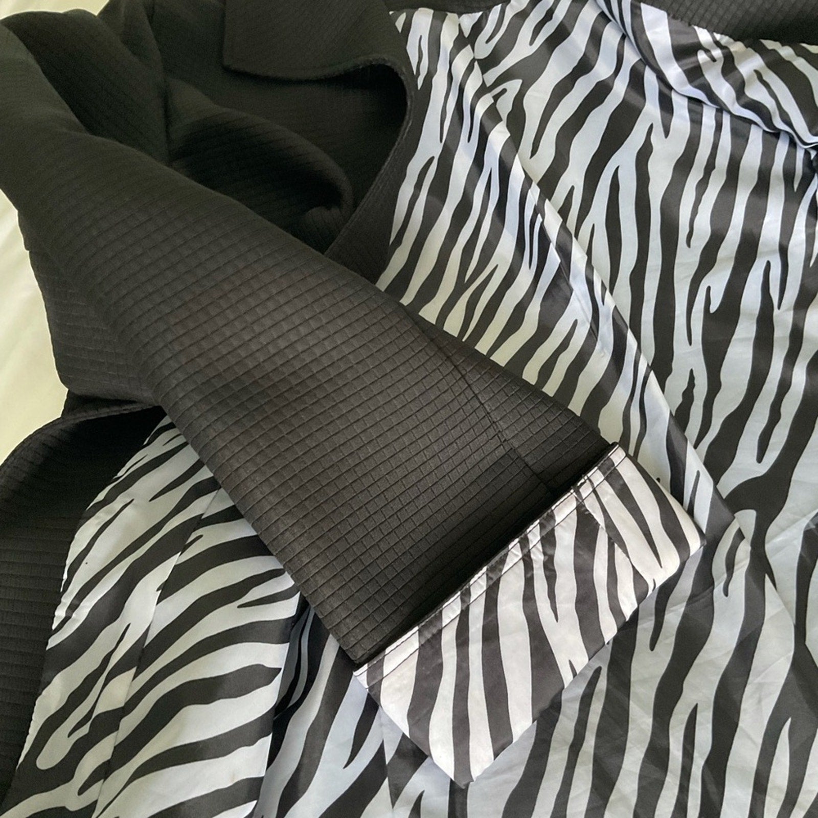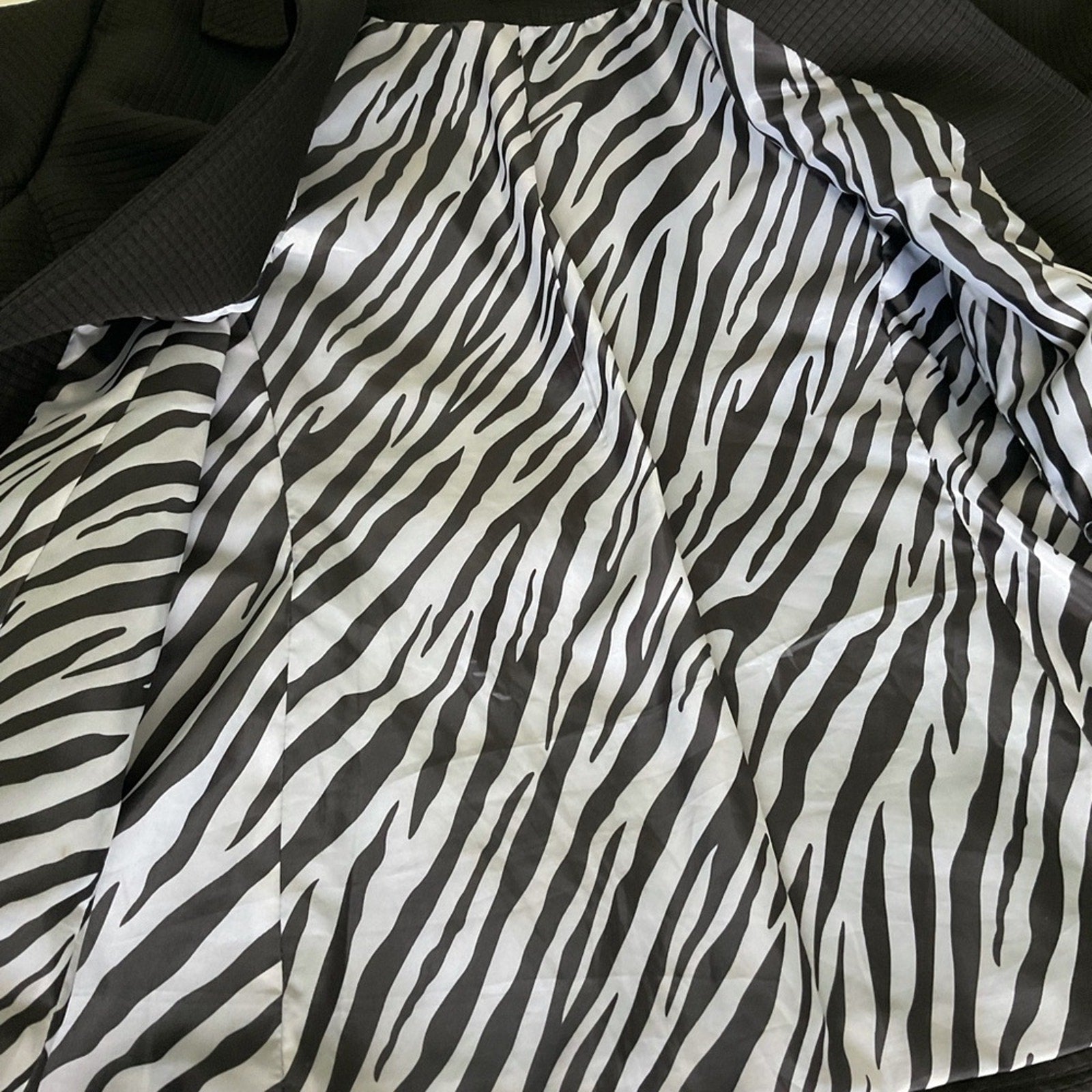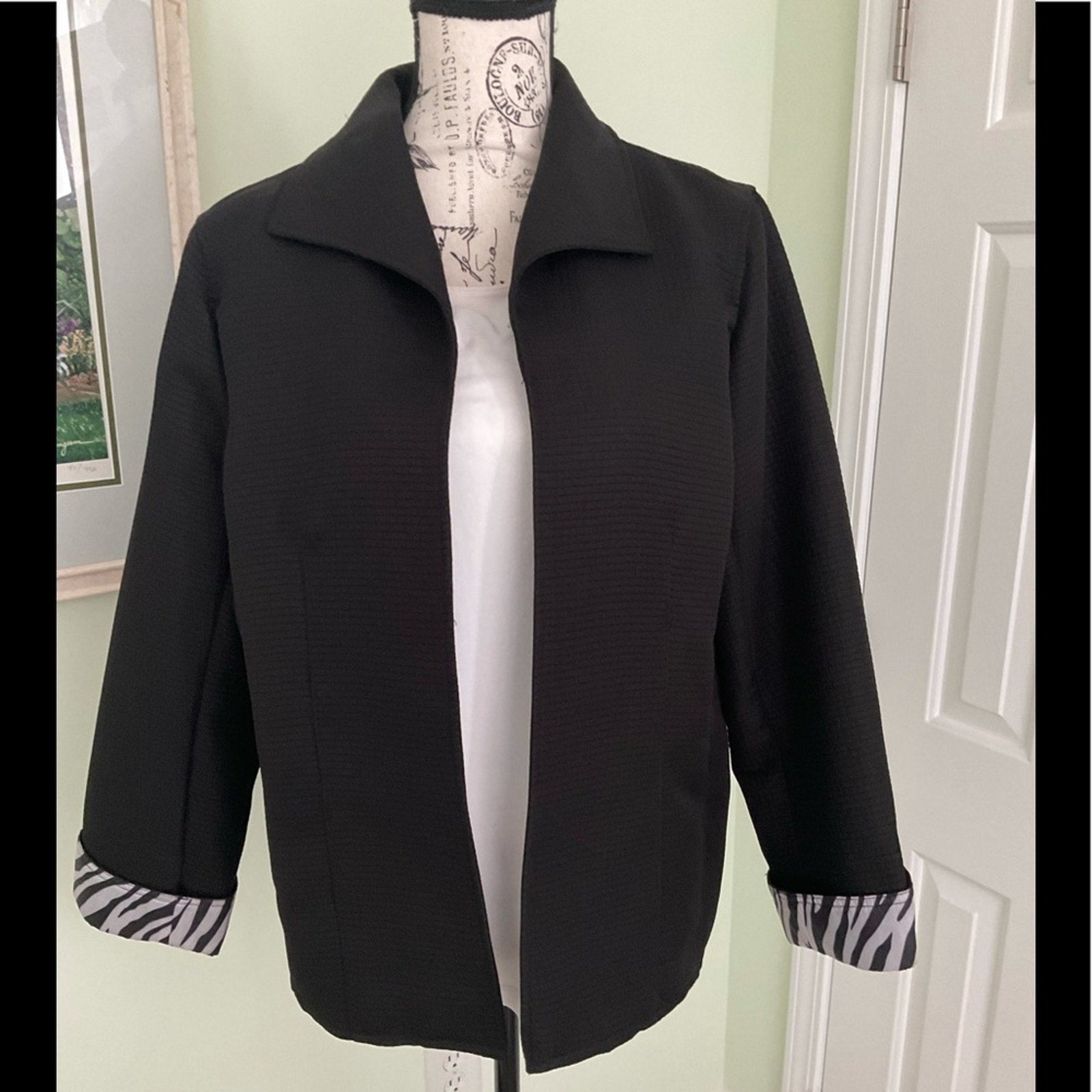 Sara Isabella open front jacket in black with zebra trim on sleeves and the silky feeling lining. This jacket does not have any closures on the front it is simply a pull on that is beautiful to wear.