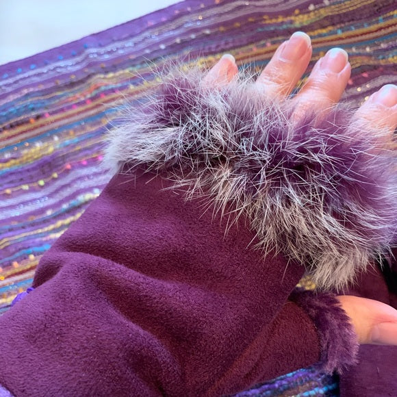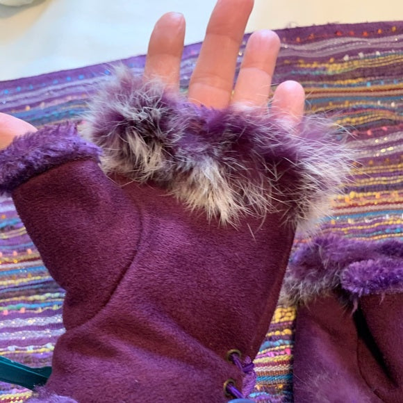 I love the adorable gloves that have the fingertip opening and fur around the fingers. Also the gloves have a closure at the wrist. There is a purple fur lining inside.