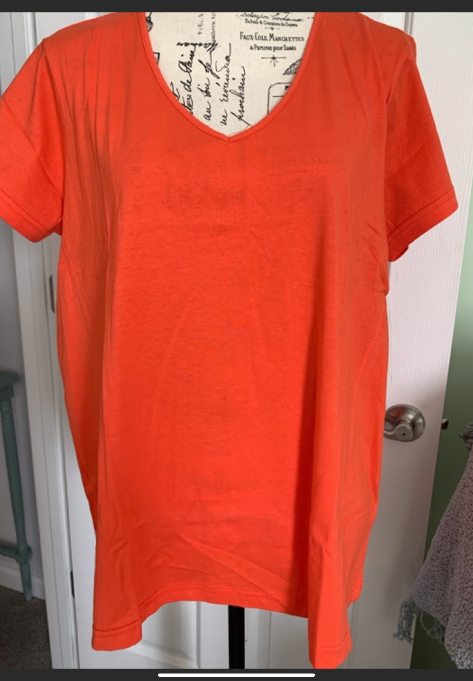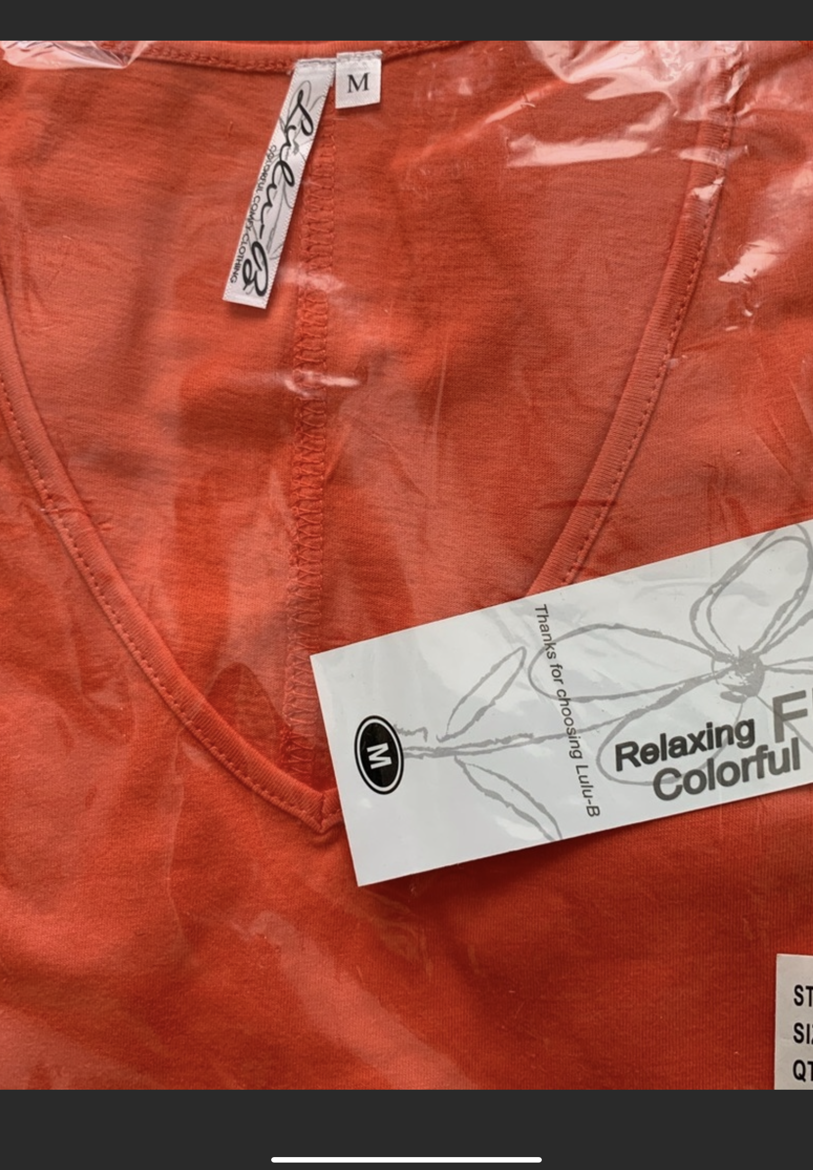 LuLu B Relaxing, fun and colorful V-neck t-shirt with a nice feel and beautiful orange color. V-neck with short sleeves, and seams to give it a more tailored look. Length in back is about an inch longer than the front, and this has a wide width at the bottom.