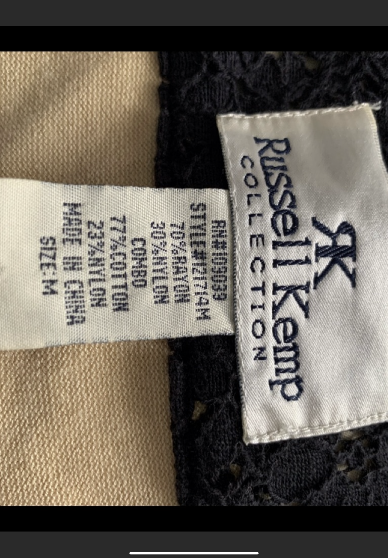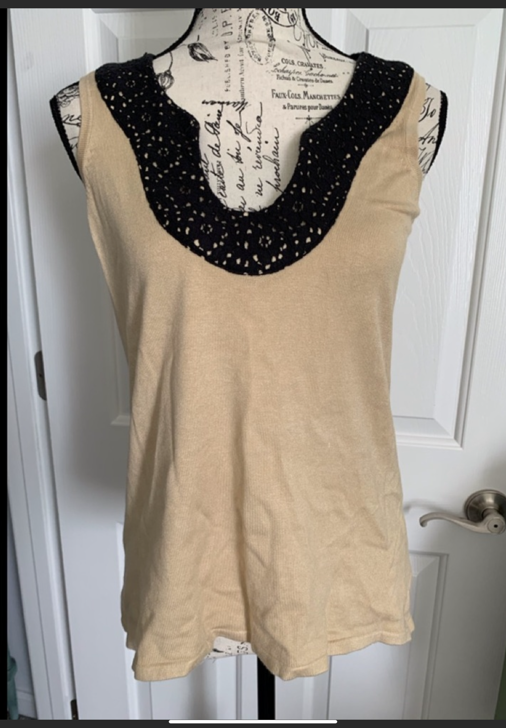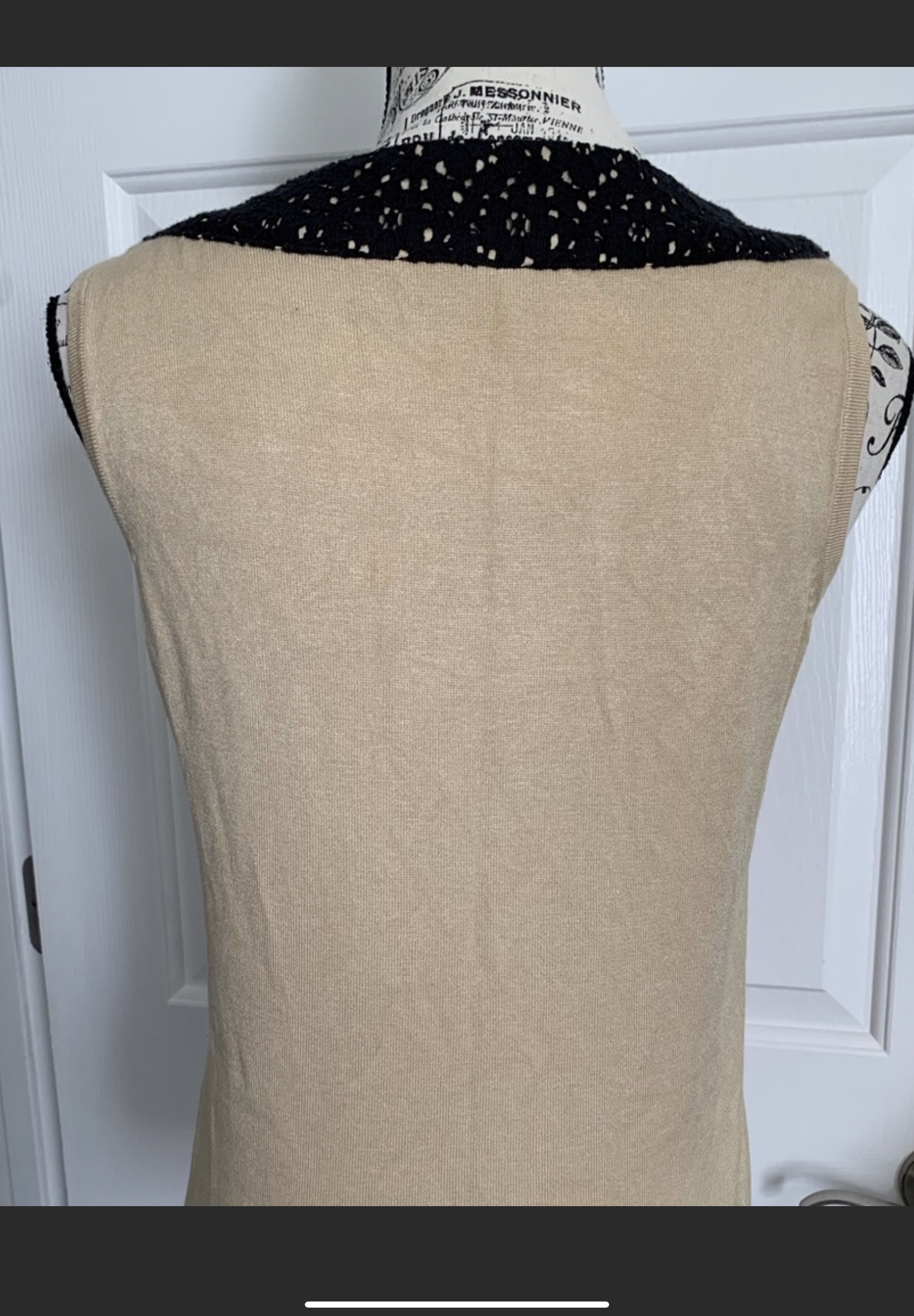 Russell Kemp sleeveless v-neck sweater in a tan color and has a black lace look detailing around the collar. This has a scoop cut out neckline.