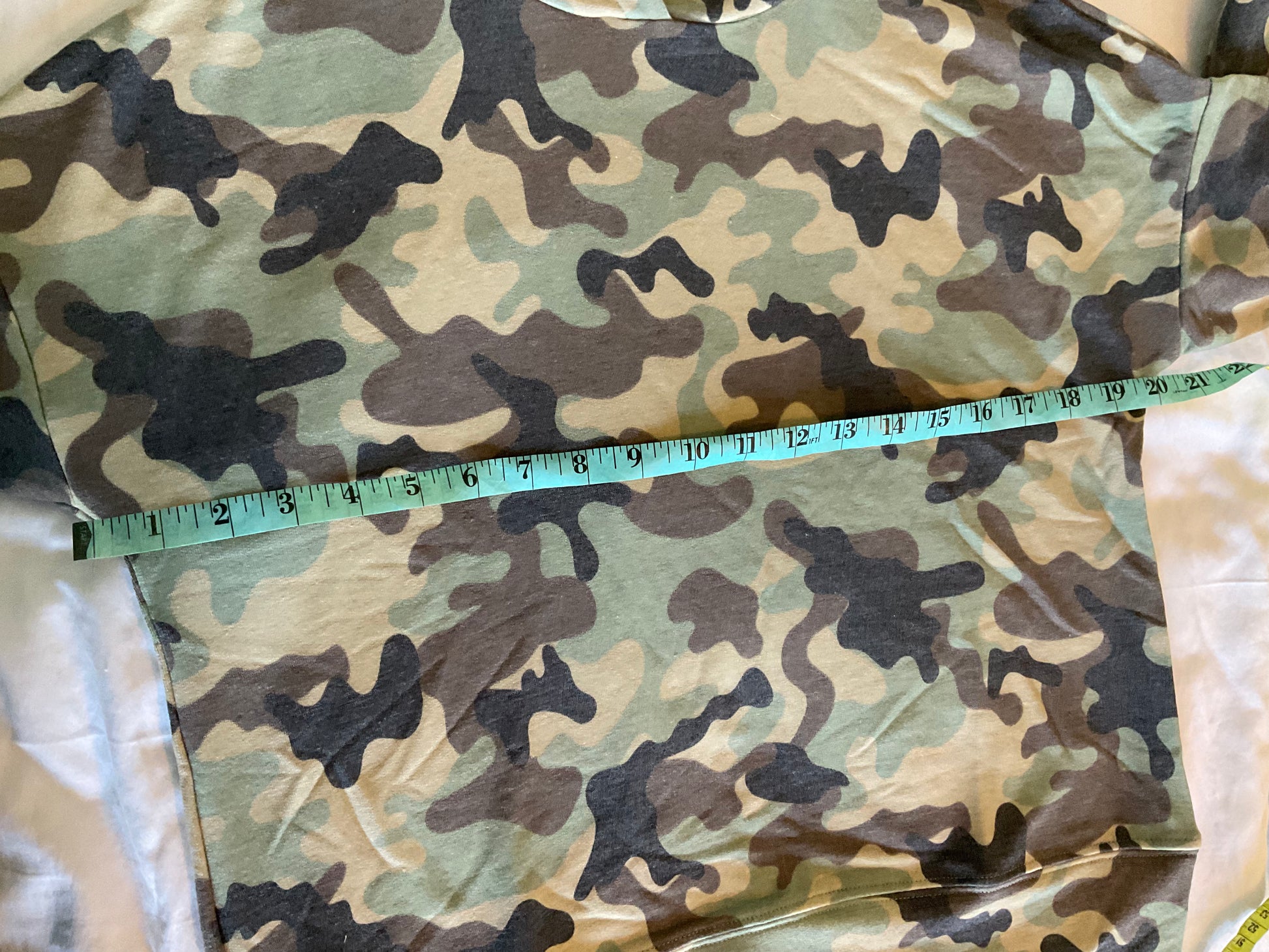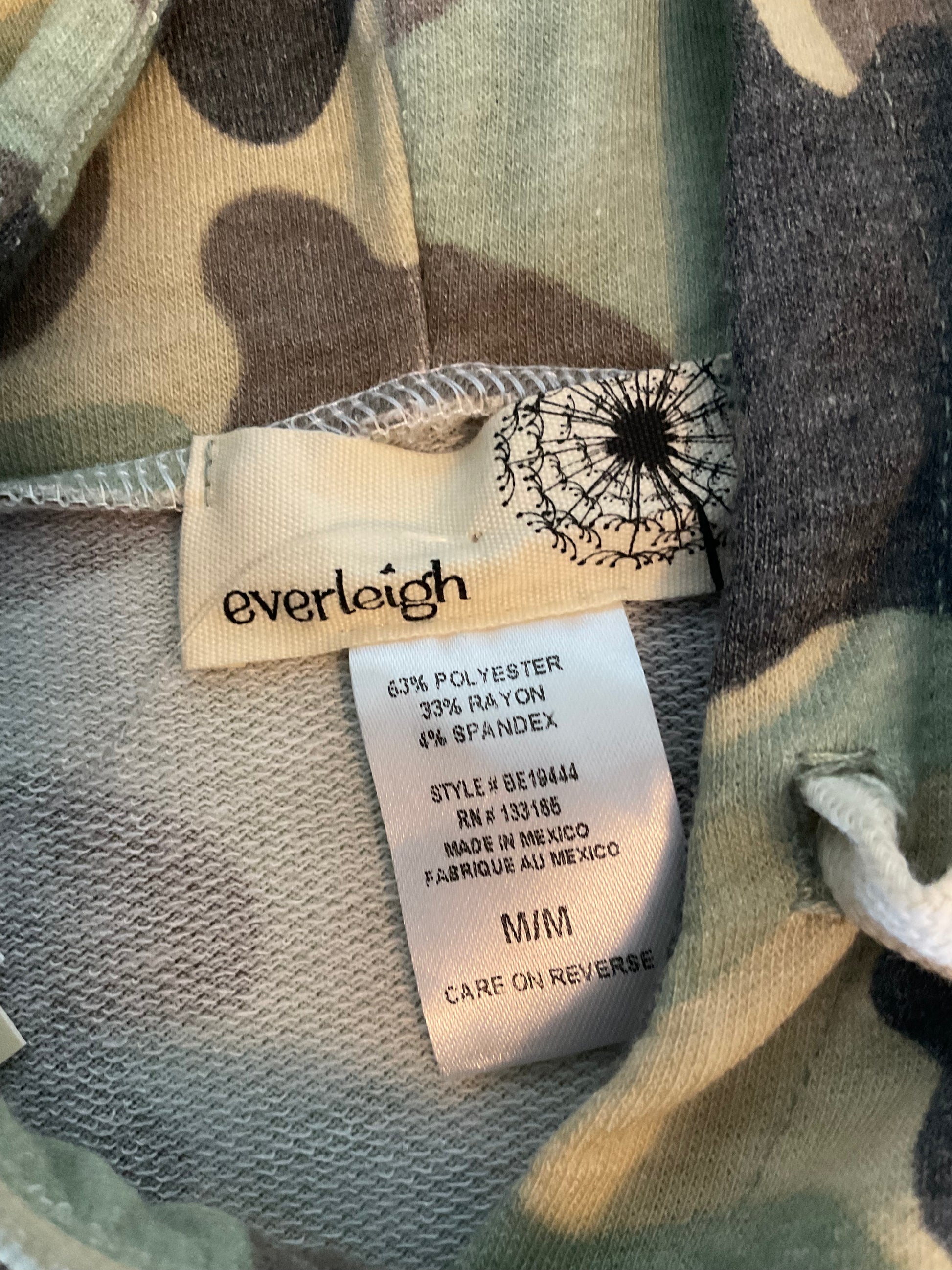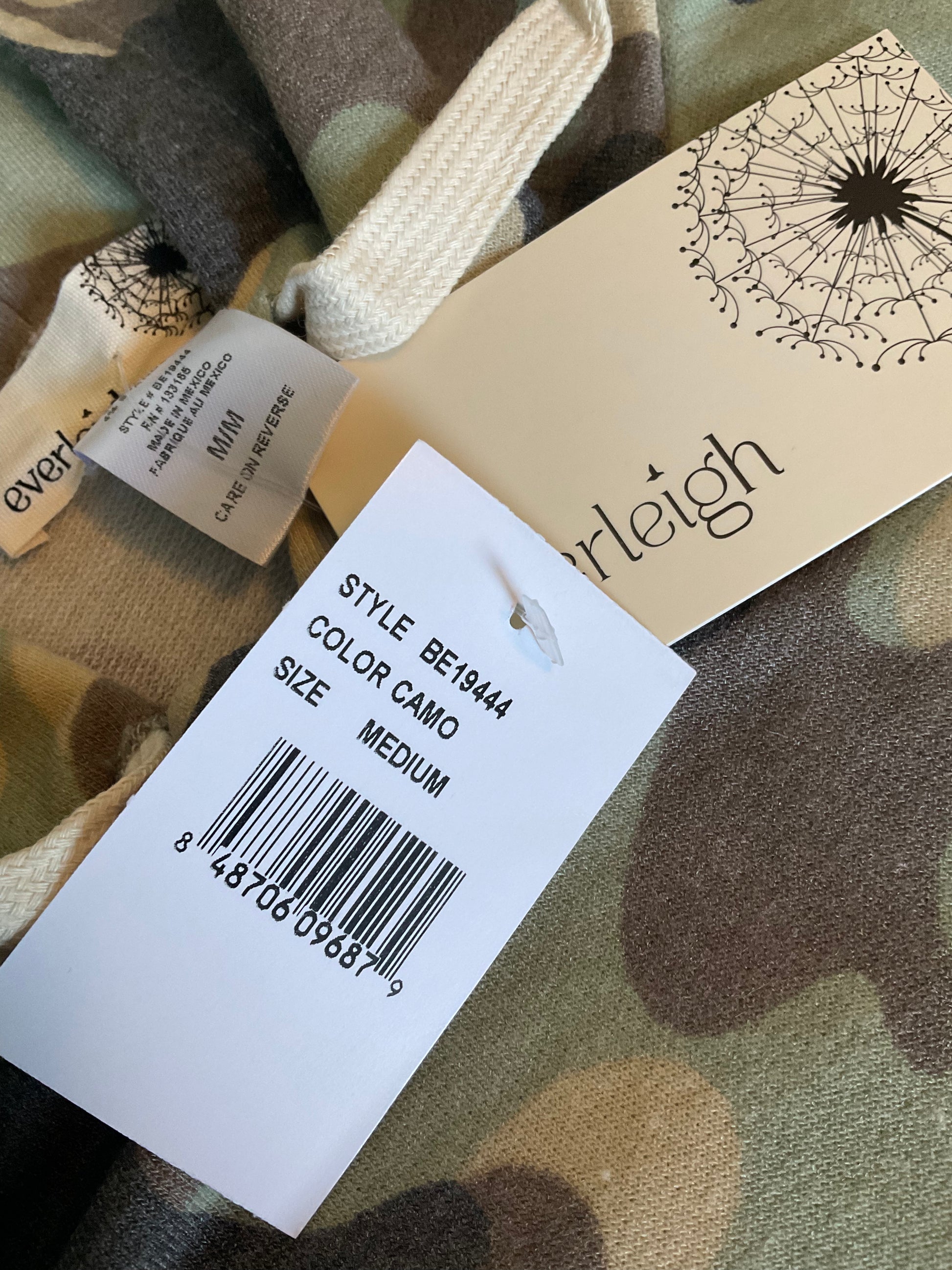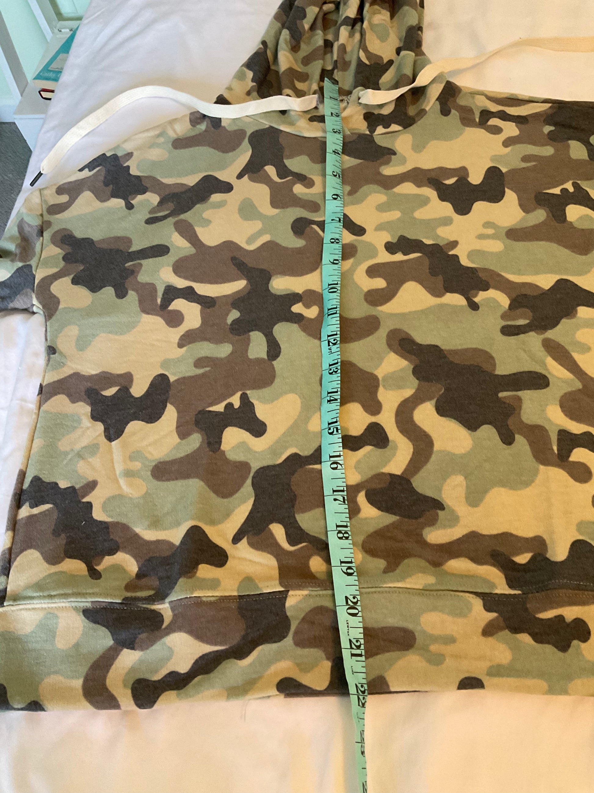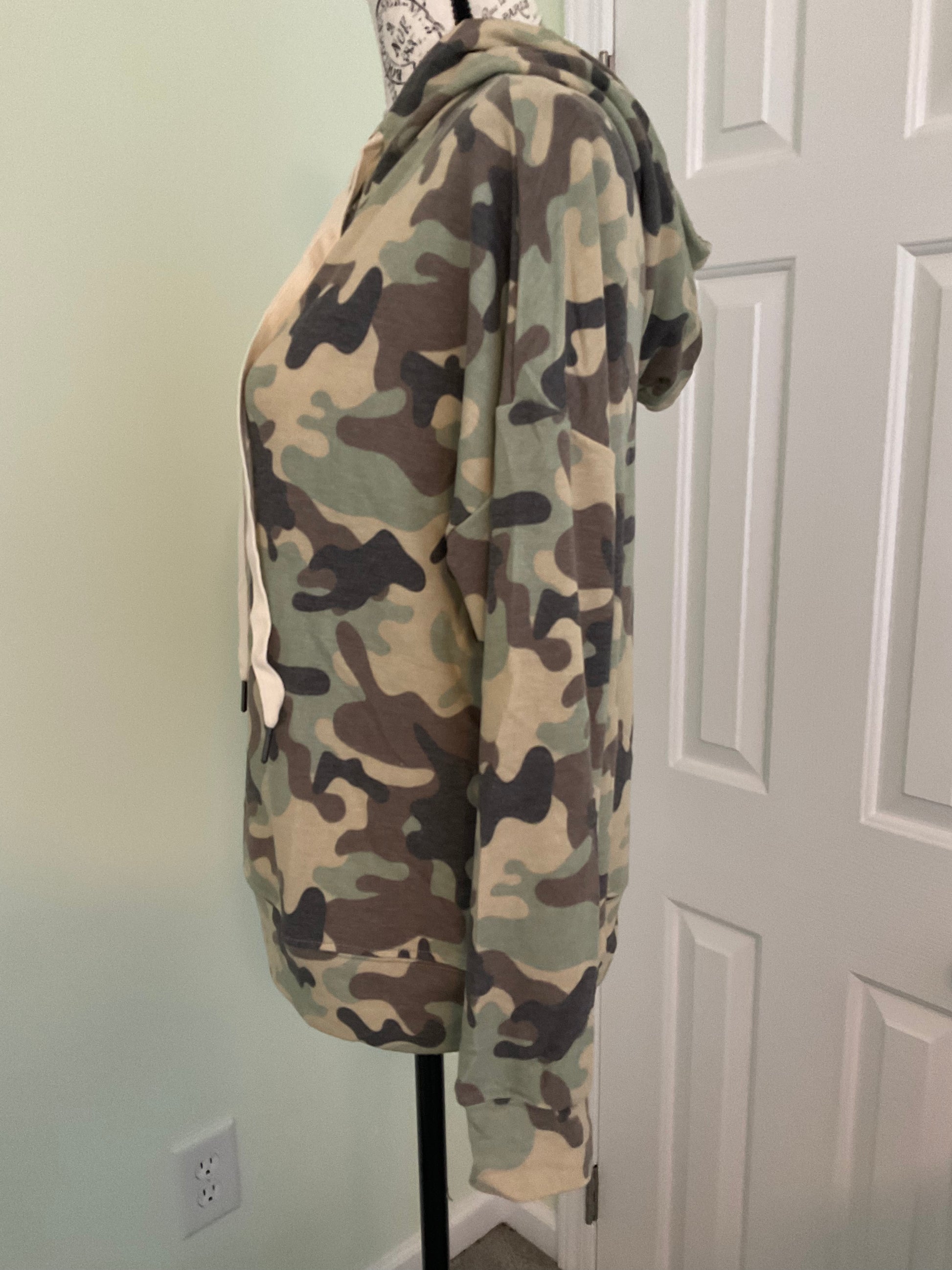 Everleigh hooded Camo Sweatshirt, with tie at the hood. Long sleeves and plain front no pouch pockets like some sweatshirts have.