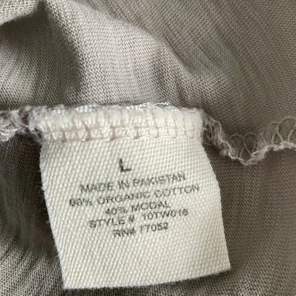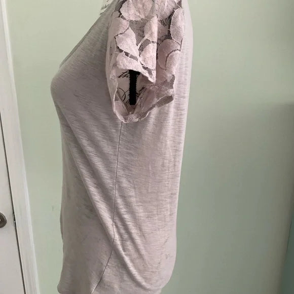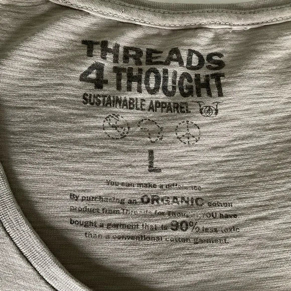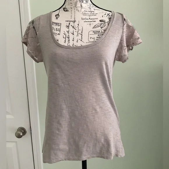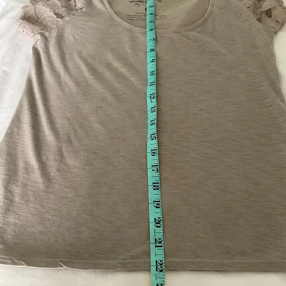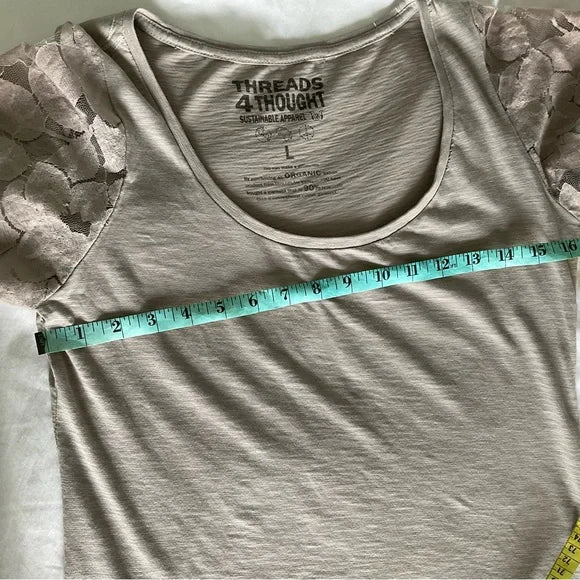 Threads 4 Thoughts sustainable apparel shirt with scoop neck. This is a Medium brown with short sleeves that are lace.