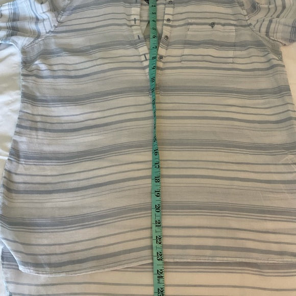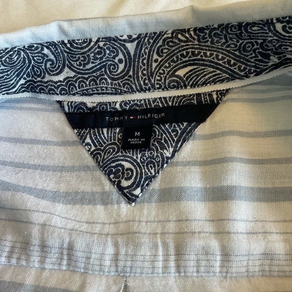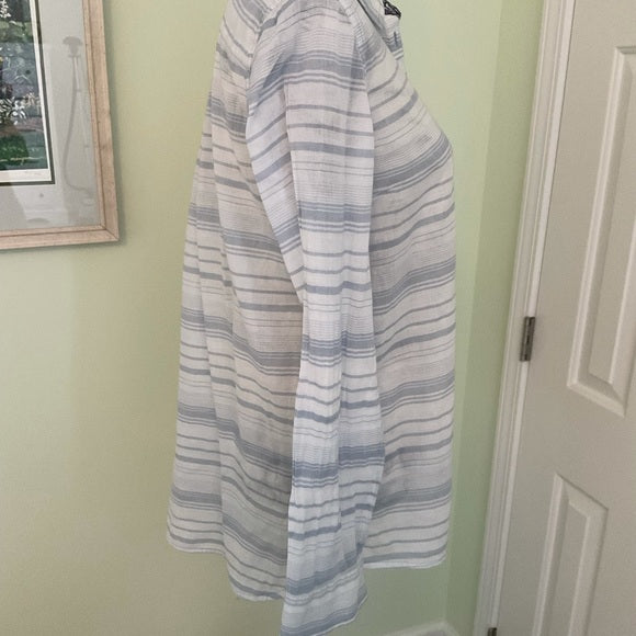 Tommy Hilfiger L/S tunic that is very lightweight. Has half button front closure and a front left breast pocket. Back length is a little longer than front. Light blue and white stripe.