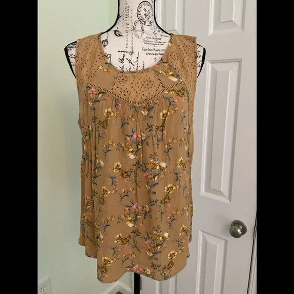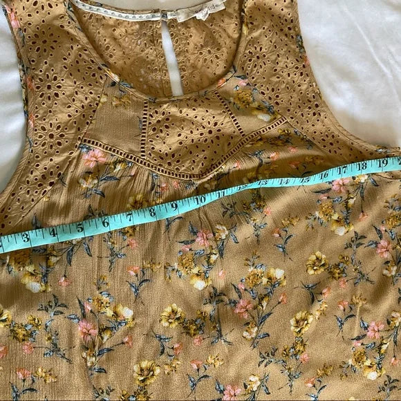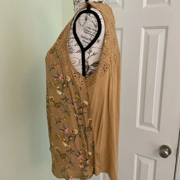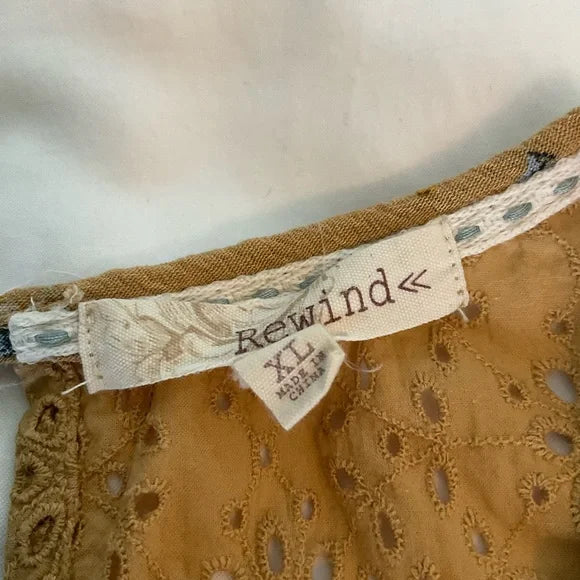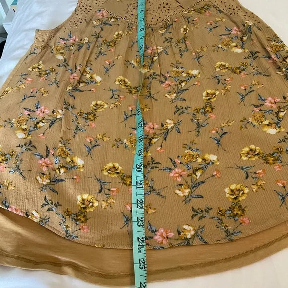 Rewind sleeveless pullover over tunic top with scoop neck and button closure on the back with slit opening. This is a gold color with lace insets on the top and small flowers on the body of the front with different colors and the back is a solid color.