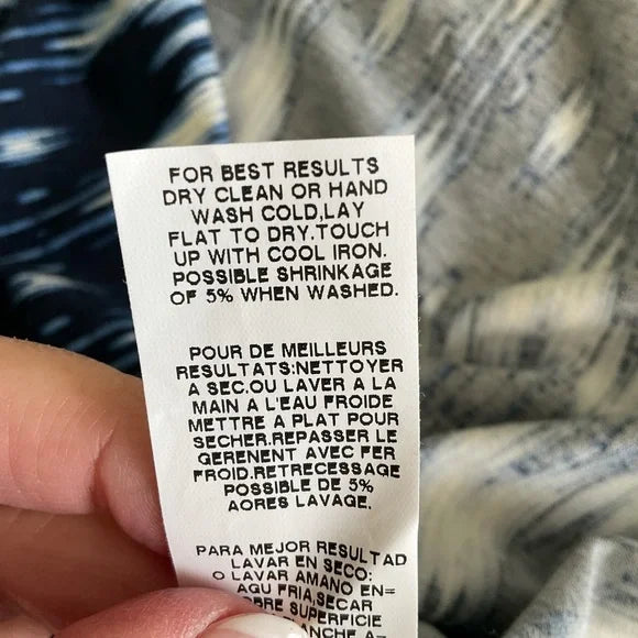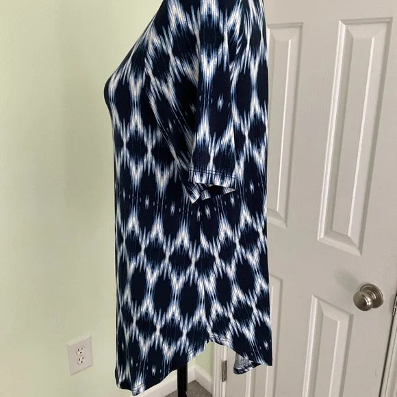 Karen Kane Tunic in blue and white geometric pattern. This tunic has short sleeves and a scoop neck. Notice in the pic the hemline is cut up on the sides and not straight across.