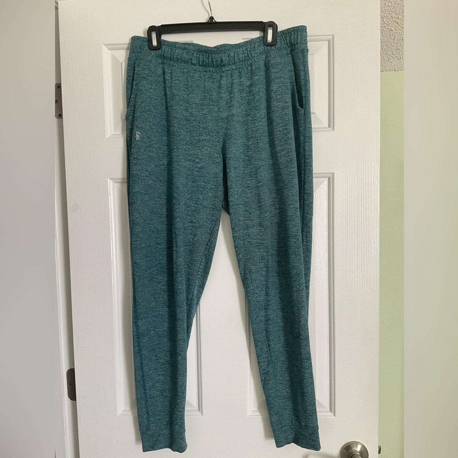 Comfortable loose heat gear track pants. These are a green white blend color. Elastic waistband. Perfect for workouts. There are holes in the front that may have been for a draw string, but there is no draw string in them. Has side seam pockets and band at the bottom of leg.