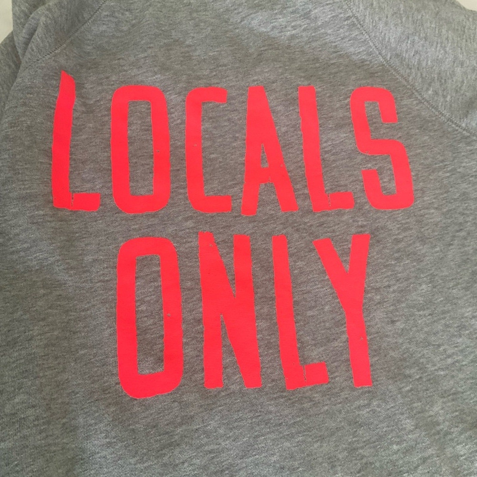 Victorian’s Secret Stylish gray hooded utility jacket. Features front pockets and zip closure. Comfortable and versatile. The back has the wording “LOCALS ONLY”
